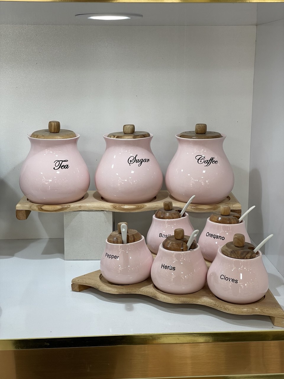 سرویس جا ادویه پاسماوری چینی درجه یک ۸ پارچه همراه با قاشق چینی و زیره و درب چوبی